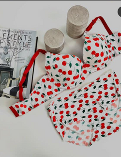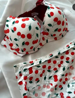Women’s Cherry Print Padded Wired Bra Set with Seamless Panty